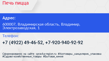 Печь-пицца по адресу 600007, Владимирская область, Владимир, Электрозаводская, 1 в дальнейшем Организация, размещена в следующих категориях: