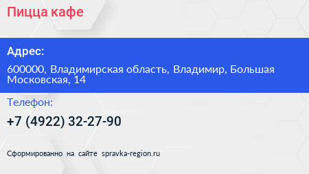 Пицца, кафе по адресу 600000, Владимирская область, Владимир, Большая Московская, 14 в дальнейшем Организация, размещена в следующих категориях:
