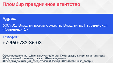 Пломбир, праздничное агентство по адресу 600901, Владимирская область, Владимир, Гвардейская (Юрьевец), 17 в дальнейшем Организация, размещена в следующих категориях: