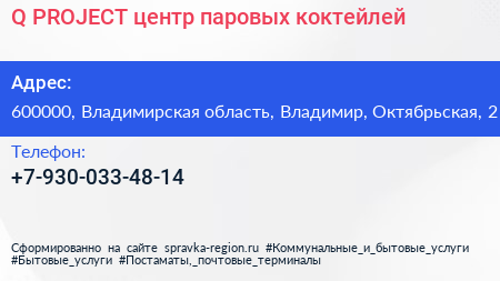 Q PROJECT, центр паровых коктейлей по адресу 600000, Владимирская область, Владимир, Октябрьская, 2 в дальнейшем Организация, размещена в следующих категориях: