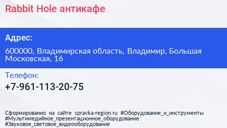 Rabbit Hole, антикафе по адресу 600000, Владимирская область, Владимир, Большая Московская, 16 в дальнейшем Организация, размещена в следующих категориях: