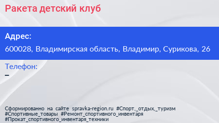 Ракета, детский клуб по адресу 600028, Владимирская область, Владимир, Сурикова, 26 в дальнейшем Организация, размещена в следующих категориях: