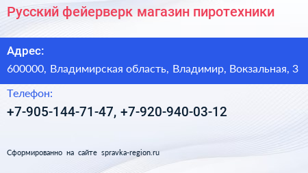 Русский фейерверк, магазин пиротехники по адресу 600000, Владимирская область, Владимир, Вокзальная, 3 в дальнейшем Организация, размещена в следующих категориях: