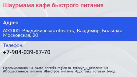 Шаурмама, кафе быстрого питания по адресу 600000, Владимирская область, Владимир, Большая Московская, 20 в дальнейшем Организация, размещена в следующих категориях: