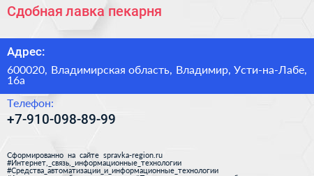 Сдобная лавка, пекарня по адресу 600020, Владимирская область, Владимир, Усти-на-Лабе, 16а в дальнейшем Организация, размещена в следующих категориях: