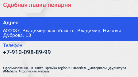 Сдобная лавка, пекарня по адресу 600037, Владимирская область, Владимир, Нижняя Дуброва, 13 в дальнейшем Организация, размещена в следующих категориях: