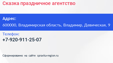 Сказка, праздничное агентство по адресу 600000, Владимирская область, Владимир, Девическая, 9 в дальнейшем Организация, размещена в следующих категориях: