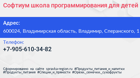 Софтиум, школа программирования для детей по адресу 600024, Владимирская область, Владимир, Сперанского, 1 в дальнейшем Организация, размещена в следующих категориях: