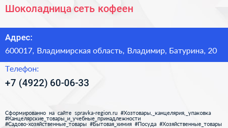 Шоколадница, сеть кофеен по адресу 600017, Владимирская область, Владимир, Батурина, 20 в дальнейшем Организация, размещена в следующих категориях: