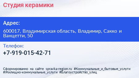 Студия керамики по адресу 600017, Владимирская область, Владимир, Сакко и Ванцетти, 50 в дальнейшем Организация, размещена в следующих категориях: