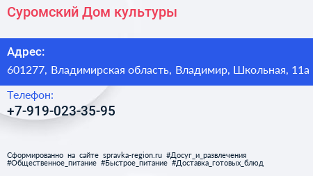Суромский Дом культуры по адресу 601277, Владимирская область, Владимир, Школьная, 11а в дальнейшем Организация, размещена в следующих категориях:
