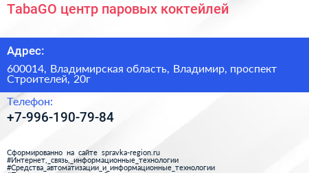 TabaGO, центр паровых коктейлей по адресу 600014, Владимирская область, Владимир, проспект Строителей, 20г в дальнейшем Организация, размещена в следующих категориях: