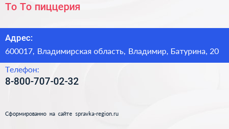 То-То, пиццерия по адресу 600017, Владимирская область, Владимир, Батурина, 20 в дальнейшем Организация, размещена в следующих категориях: