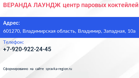 ВЕРАНДА-ЛАУНДЖ, центр паровых коктейлей по адресу 601270, Владимирская область, Владимир, Западная, 10а в дальнейшем Организация, размещена в следующих категориях: