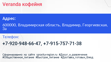 Veranda, кофейня по адресу 600000, Владимирская область, Владимир, Георгиевская, 3а в дальнейшем Организация, размещена в следующих категориях: