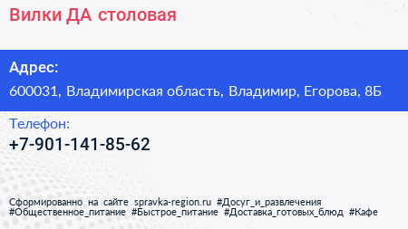 Вилки ДА, столовая по адресу 600031, Владимирская область, Владимир, Егорова, 8Б в дальнейшем Организация, размещена в следующих категориях: