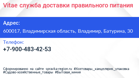 Vitae, служба доставки правильного питания по адресу 600017, Владимирская область, Владимир, Батурина, 30 в дальнейшем Организация, размещена в следующих категориях: