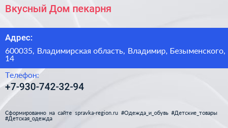 Вкусный Дом, пекарня по адресу 600035, Владимирская область, Владимир, Безыменского, 14 в дальнейшем Организация, размещена в следующих категориях: