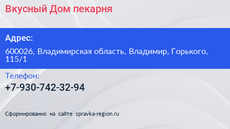 Вкусный Дом, пекарня по адресу 600026, Владимирская область, Владимир, Горького, 115/1 в дальнейшем Организация, размещена в следующих категориях: