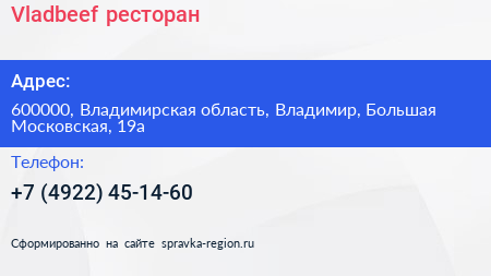 Vladbeef, ресторан по адресу 600000, Владимирская область, Владимир, Большая Московская, 19а в дальнейшем Организация, размещена в следующих категориях: