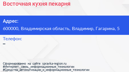 Восточная кухня, пекарня по адресу 600000, Владимирская область, Владимир, Гагарина, 5 в дальнейшем Организация, размещена в следующих категориях: