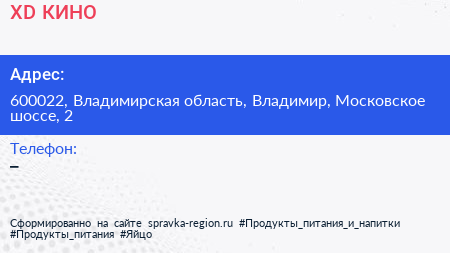 XD КИНО по адресу 600022, Владимирская область, Владимир, Московское шоссе, 2 в дальнейшем Организация, размещена в следующих категориях: