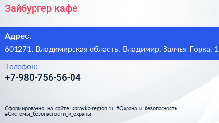Зайбургер, кафе по адресу 601271, Владимирская область, Владимир, Заячья Горка, 1 в дальнейшем Организация, размещена в следующих категориях:
