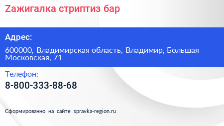 Zажигалка, стриптиз-бар по адресу 600000, Владимирская область, Владимир, Большая Московская, 71 в дальнейшем Организация, размещена в следующих категориях: