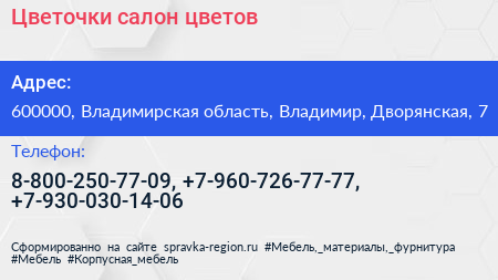 Цветочки, салон цветов по адресу 600000, Владимирская область, Владимир, Дворянская, 7 в дальнейшем Организация, размещена в следующих категориях: