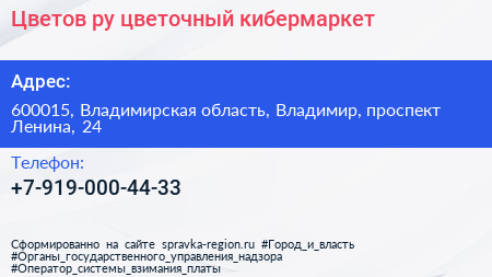 Цветов.ру, цветочный кибермаркет по адресу 600015, Владимирская область, Владимир, проспект Ленина, 24 в дальнейшем Организация, размещена в следующих категориях:
