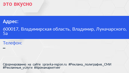 #это вкусно по адресу 600017, Владимирская область, Владимир, Луначарского, 5а в дальнейшем Организация, размещена в следующих категориях: