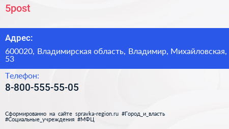 5post по адресу 600020, Владимирская область, Владимир, Михайловская, 53 в дальнейшем Организация, размещена в следующих категориях:
