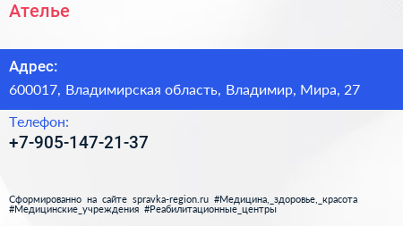 Ателье по адресу 600017, Владимирская область, Владимир, Мира, 27 в дальнейшем Организация, размещена в следующих категориях:
