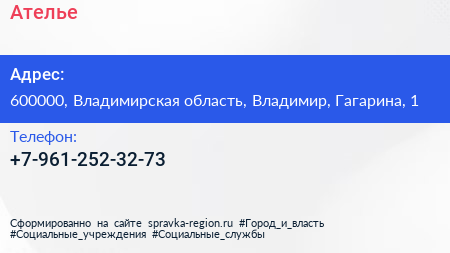 Ателье по адресу 600000, Владимирская область, Владимир, Гагарина, 1 в дальнейшем Организация, размещена в следующих категориях: