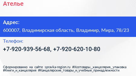 Ателье по адресу 600007, Владимирская область, Владимир, Мира, 78/23 в дальнейшем Организация, размещена в следующих категориях: