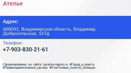Ателье по адресу 600031, Владимирская область, Владимир, Добросельская, 167д в дальнейшем Организация, размещена в следующих категориях: