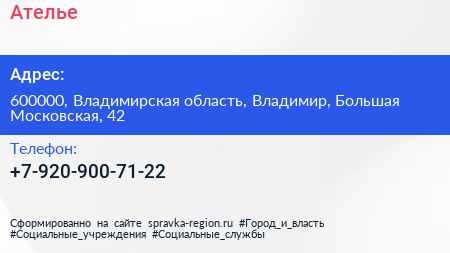 Ателье по адресу 600000, Владимирская область, Владимир, Большая Московская, 42 в дальнейшем Организация, размещена в следующих категориях: