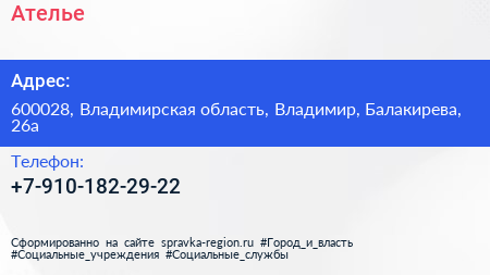 Ателье по адресу 600028, Владимирская область, Владимир, Балакирева, 26а в дальнейшем Организация, размещена в следующих категориях: