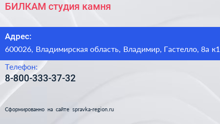 БИЛКАМ, студия камня по адресу 600026, Владимирская область, Владимир, Гастелло, 8а к1 в дальнейшем Организация, размещена в следующих категориях: