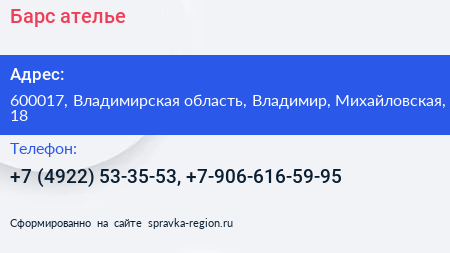 Барс, ателье по адресу 600017, Владимирская область, Владимир, Михайловская, 18 в дальнейшем Организация, размещена в следующих категориях: