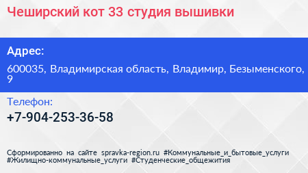 Чеширский кот 33, студия вышивки по адресу 600035, Владимирская область, Владимир, Безыменского, 9 в дальнейшем Организация, размещена в следующих категориях: