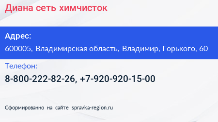 Диана, сеть химчисток по адресу 600005, Владимирская область, Владимир, Горького, 60 в дальнейшем Организация, размещена в следующих категориях: