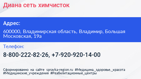 Диана, сеть химчисток по адресу 600000, Владимирская область, Владимир, Большая Московская, 19а в дальнейшем Организация, размещена в следующих категориях: