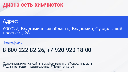 Диана, сеть химчисток по адресу 600027, Владимирская область, Владимир, Суздальский проспект, 28 в дальнейшем Организация, размещена в следующих категориях: