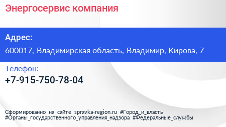 Энергосервис, компания по адресу 600017, Владимирская область, Владимир, Кирова, 7 в дальнейшем Организация, размещена в следующих категориях: