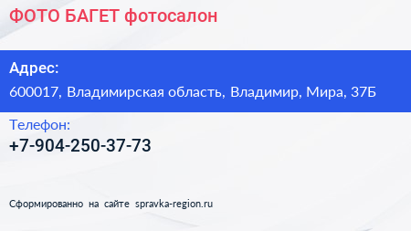 ФОТО & БАГЕТ, фотосалон по адресу 600017, Владимирская область, Владимир, Мира, 37Б в дальнейшем Организация, размещена в следующих категориях: