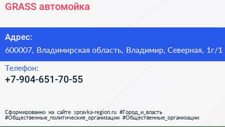 GRASS, автомойка по адресу 600007, Владимирская область, Владимир, Северная, 1г/1 в дальнейшем Организация, размещена в следующих категориях: