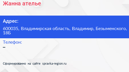 Жанна, ателье по адресу 600035, Владимирская область, Владимир, Безыменского, 18Б в дальнейшем Организация, размещена в следующих категориях: