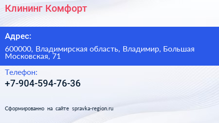 Клининг Комфорт по адресу 600000, Владимирская область, Владимир, Большая Московская, 71 в дальнейшем Организация, размещена в следующих категориях: