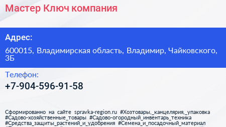 Мастер Ключ, компания по адресу 600015, Владимирская область, Владимир, Чайковского, 3Б в дальнейшем Организация, размещена в следующих категориях: